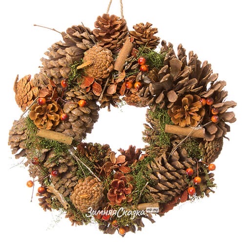 - венок из еловых веток (искусственных или натуральных) с шишками, желудями, яркими бусинками, лентами; также венок можно сделать из сухих палочек;