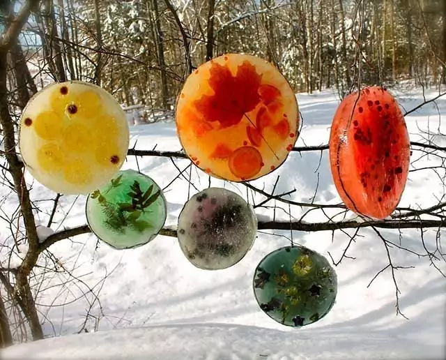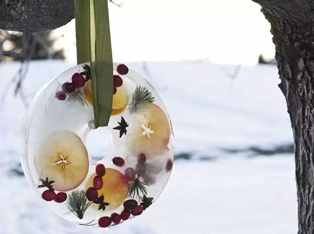 По периметру дома можно развесить игрушки из льда, в которых заморожены фрукты и ягоды.