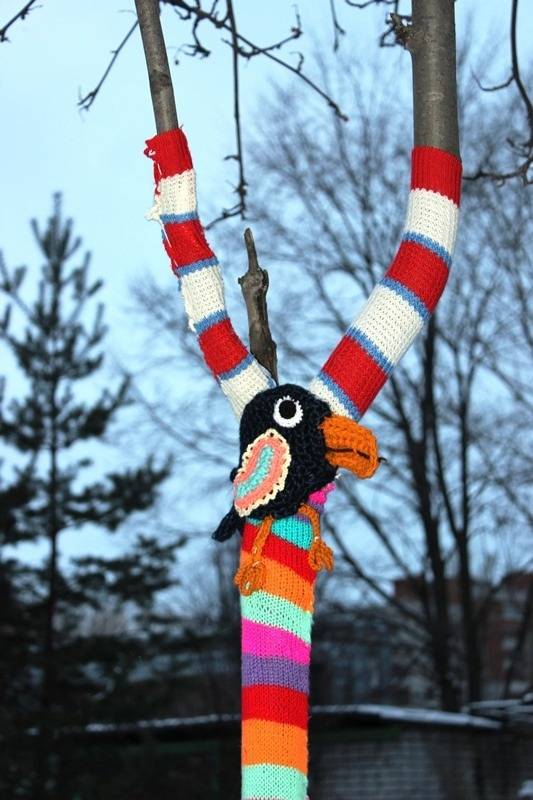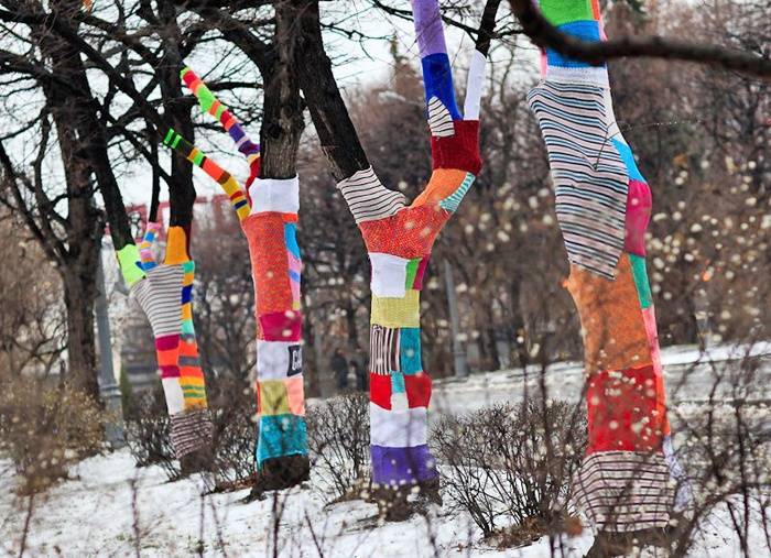 Первое, что нужно оформить в школе – фасад здания. Именно эту часть ученики видят первой, приходя каждый день на занятия. Уже подходя к дверям, дети будут понимать и чувствовать, что в школе воцарился сказочный и волшебный праздничный мир. Не просто же так проводятся ежегодно конкурсы по лучшему оформлению фасада учебного заведения. Предлагаем вам креативно подойти к оформлению двора школы и использовать креативную технику «yarnbombing». Суть этой техники заключается в вязании яркой одежды для уличных предметов и деревьев. Еще можно установить на входе в школу различные дизайнерские букеты, выполненные в новогодней тематике.