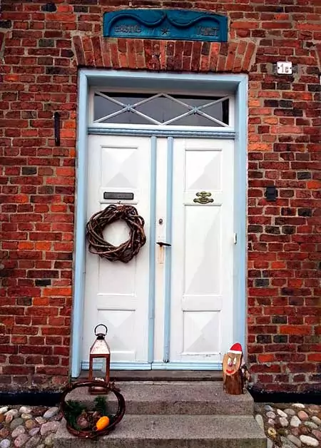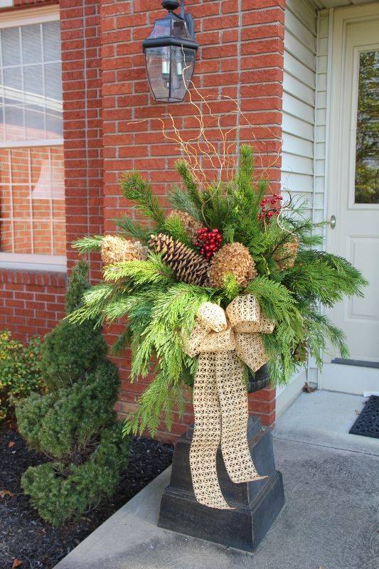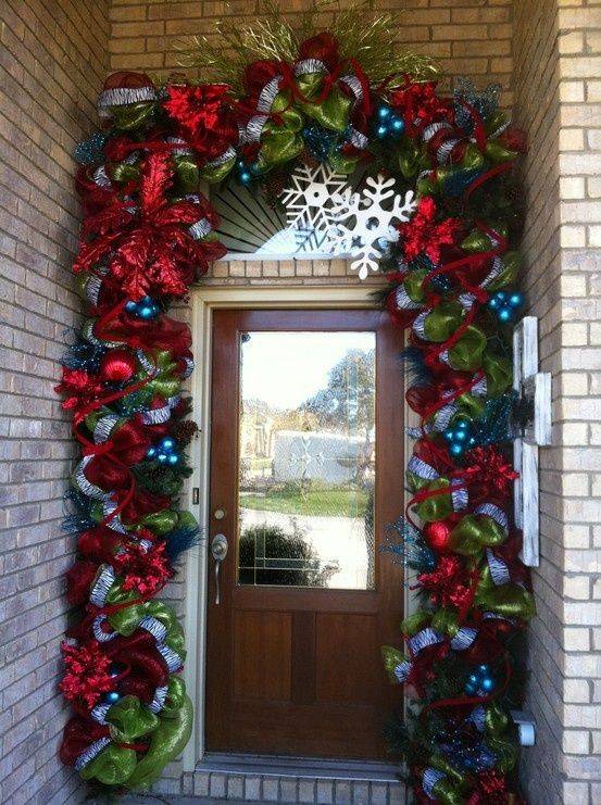 Входную дверь со стороны оформляют с помощью декоративных элементов: венки, светильники, композиции.