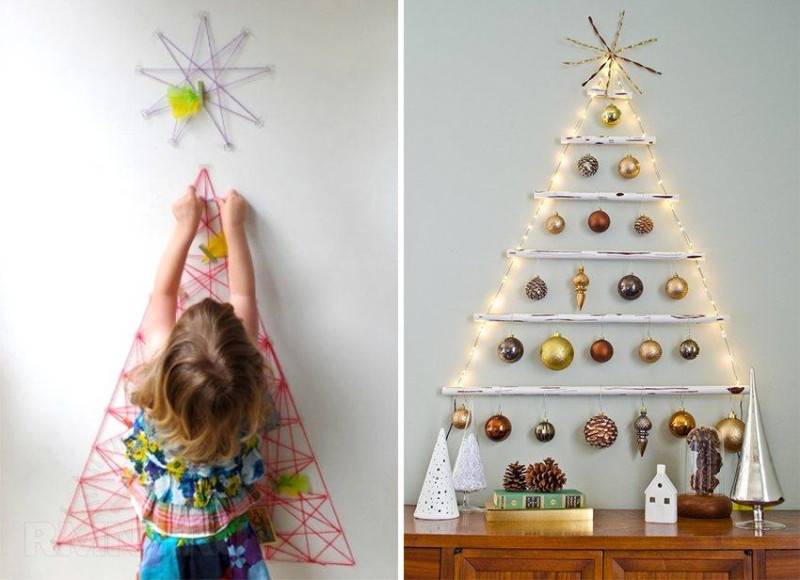 - рождественская елка на стене. Создать настенную елку можно из хвои, веточек, палочек и веревочек. Она может быть выполнена из бумаги. Дети могут сами создать детали конструкции. Повесить ель на стену поможет учитель. У основания елки можно наклеить подарки из бумаг;