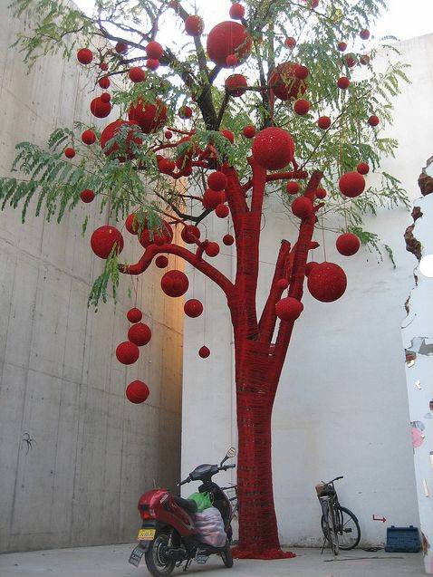 Елочки на улице тоже нуждаются в оригинальном декоре.