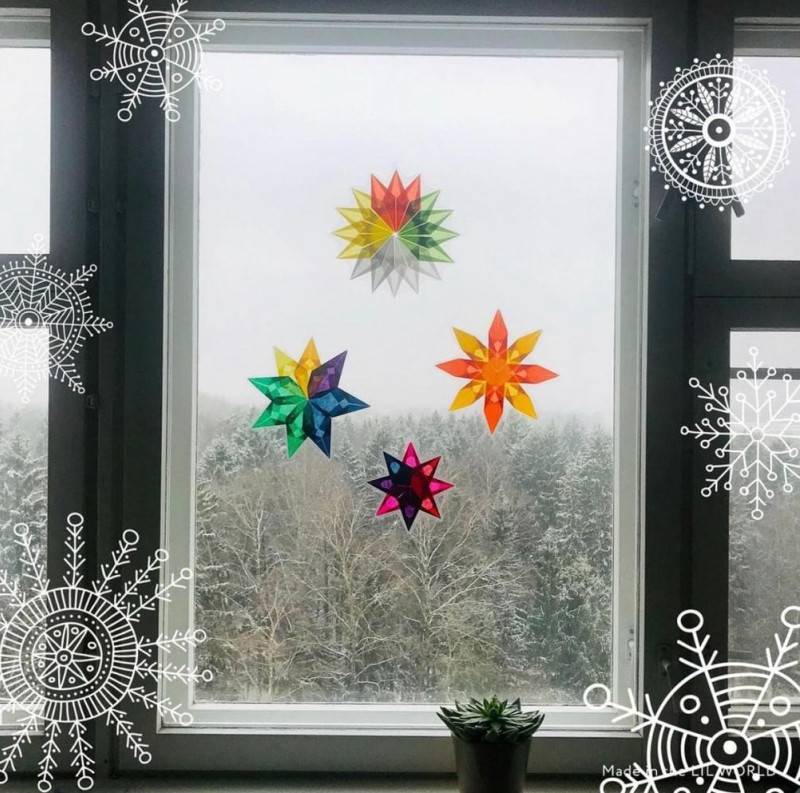 - Снежинки, пожалуй, самый бюджетный и испытанный временем метод украшения окон. Своими руками дети могут вырезать множество снежинок разных форм и размеров, а взрослые помогут красиво украсить ими стекло. Конкурс на самую красивую снежинку добавит соревновательности праздничным дням.
