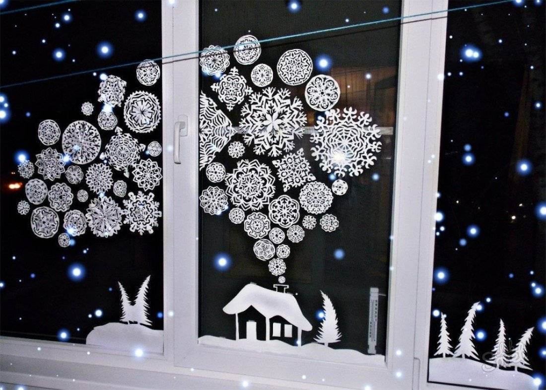- Снежинки, пожалуй, самый бюджетный и испытанный временем метод украшения окон. Своими руками дети могут вырезать множество снежинок разных форм и размеров, а взрослые помогут красиво украсить ими стекло. Конкурс на самую красивую снежинку добавит соревновательности праздничным дням.