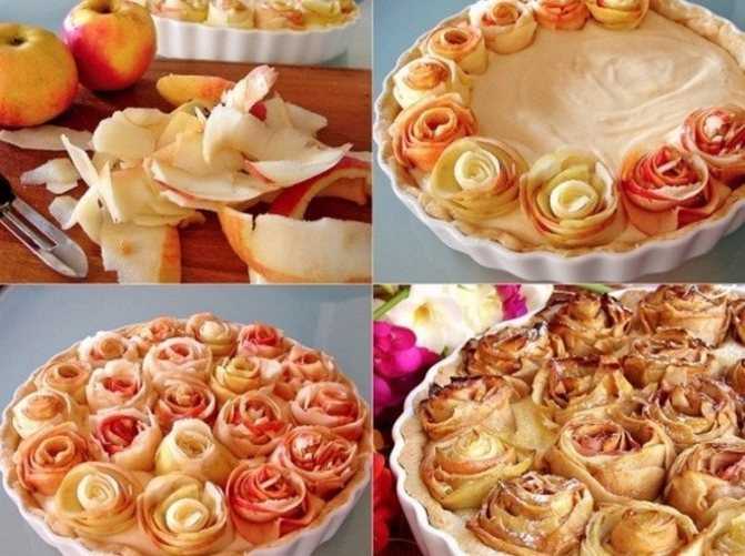 Возьмите специальный нож для чистки овощей, срежьте полоски с яблок или кабачков, сформируйте из них розы и выложите в основу для пирога.