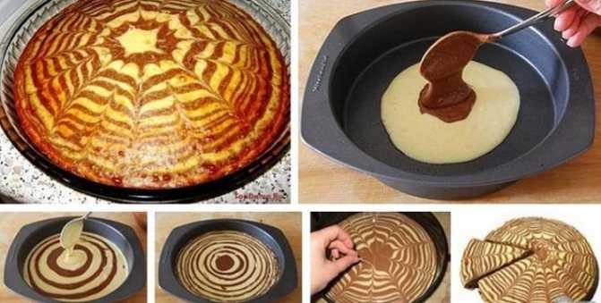 «Зебра» — один из популярнейших тортов прошлого века. Приготовьте две миски теста: шоколадное и обычное. Выложите его слоями. Зубочисткой проведите пару неглубоких линий от центра пирога к краю. Получится красивый узор. Отправьте пирог в духовку.