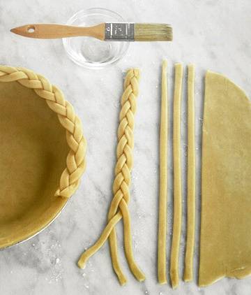 Это наиболее распространенный метод нанесения узоров на печеные изделия. Ведь не найдется такой хозяйки, которая не умела бы заплетать косы. Для этого необходимо раскатать тесто и нарезать на примерно равные полосы. Толщина будет зависеть от того, какого размера косички необходимы для украшения. Теперь предстоит сплести заготовки, соединяя их по три штуки.