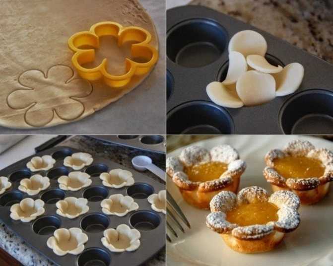 Выложите цветы из теста в формочки для маффинов. Испеките их в духовке. После остудите и положите варенье или любимую начинку внутрь. Посыпьте сахарной пудрой.