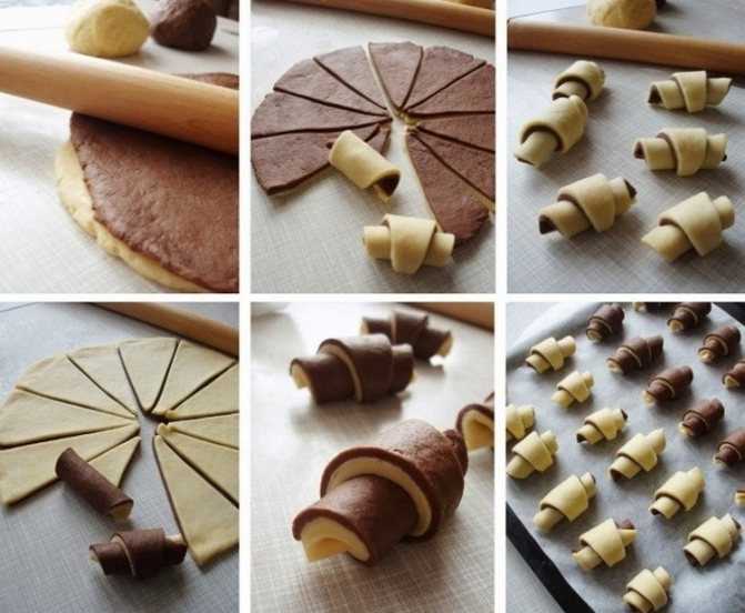Раскатайте два круга теста разного цвета. Положите один слой на другой, разрежьте и сверните рогалики.