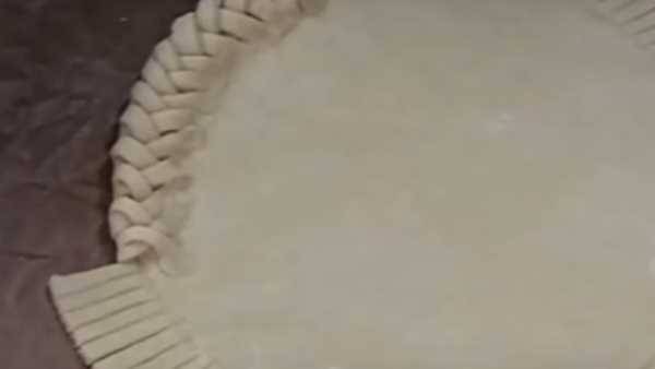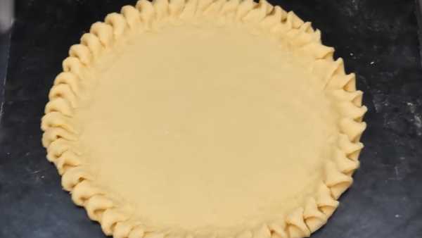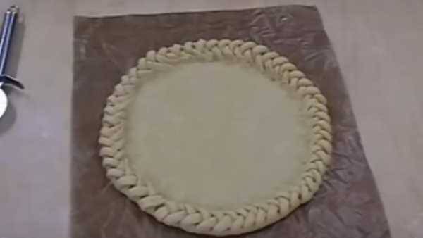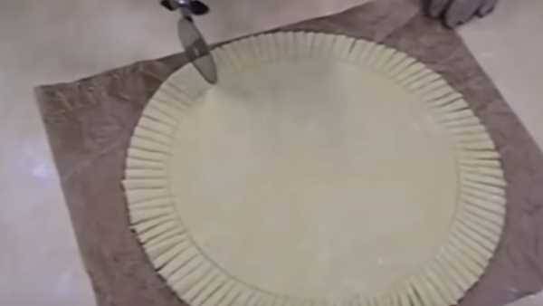 Раскатать из теста большой тонкий пласт, а затем из него вырезать ровный круг. На получившейся заготовке сделать круглый оттиск меньшего диаметра. Воспользуйтесь крышкой от кастрюли, размер которой должен быть на три-четыре сантиметра меньше основы, до этой линии будут нарезаться ленты. Всю окружность изрезать в одинакового размера лапшу, после чего можно начинать украшать край.