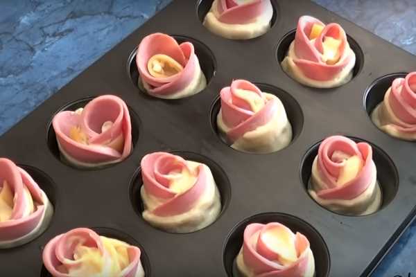А сейчас хочу показать вам милые розочки с колбасой испеченные в формочках для кексов. Здесь закрыть ничего не придется, а только нужно будет красиво свернуть.