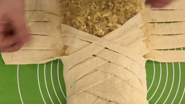 Закрыть сверху жгутиками или полосками из теста. Лишнее обрезать ножницами.