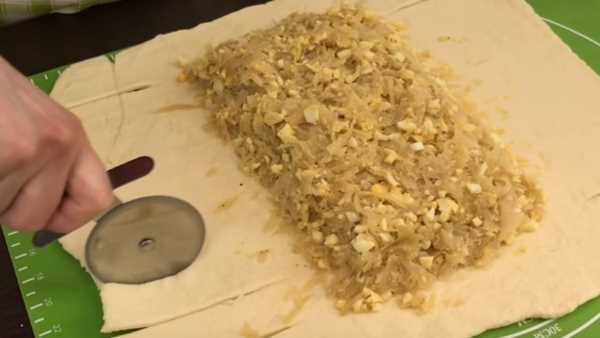 - Разморозьте тесто. Раскатайте его скалкой. Разрежьте на квадратики размером по 12-15 см. Слегка смочите края каждого кусочка водой.