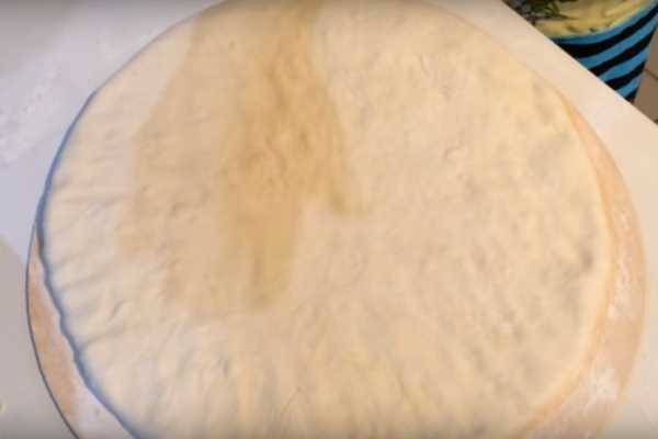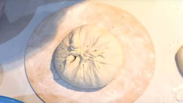 Затем перевернуть будущий пирог к верху дном и слегка его придавить. Снова перевернуть. Разминать ладонями от середины к краю.