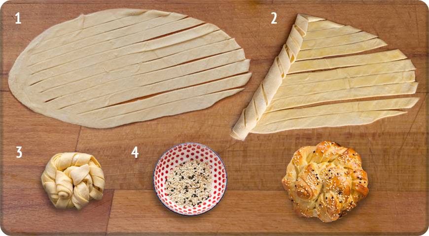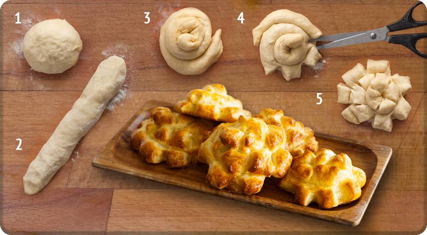 Если скатать толстый и короткий жгут, его можно сложить спиралью, надрезать кухонными ножницами и перед вами — фигурная булочка.