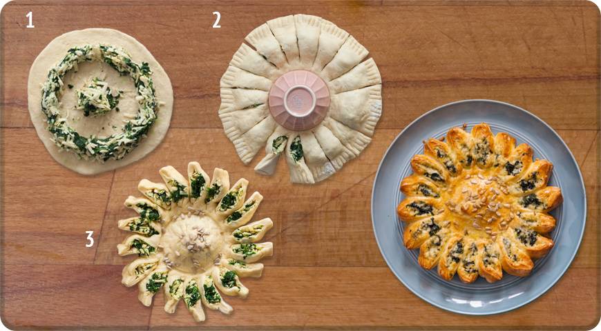 А это уже переход к большим формам. Пирог с молодым шпинатом всегда хорош, а если ему придать ещё и интересную форму — он точно станет темой для обсуждения.