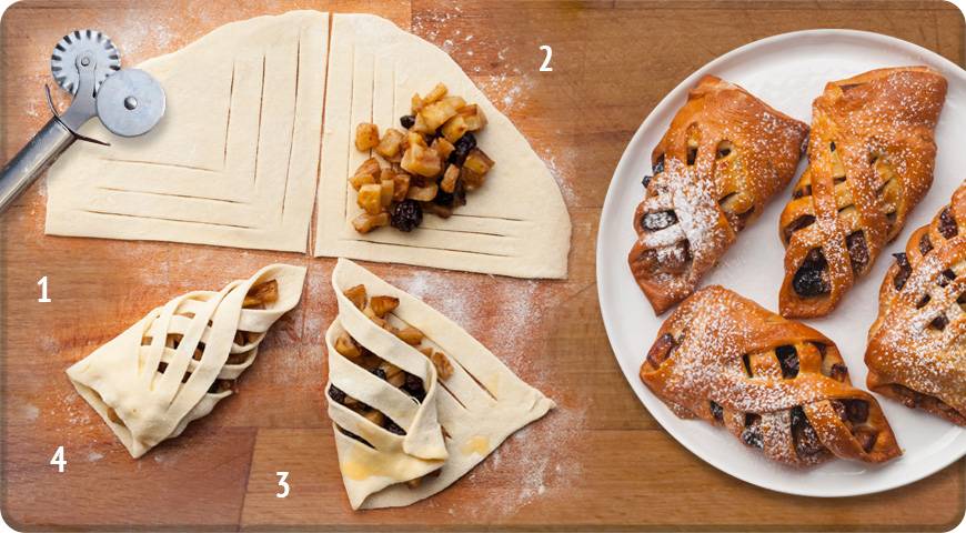 Раскатайте тесто. Нарежьте его таким способом, как на фото. Выложите тертые яблоки, смешанные с небольшим количеством лимонного сока, заверните!