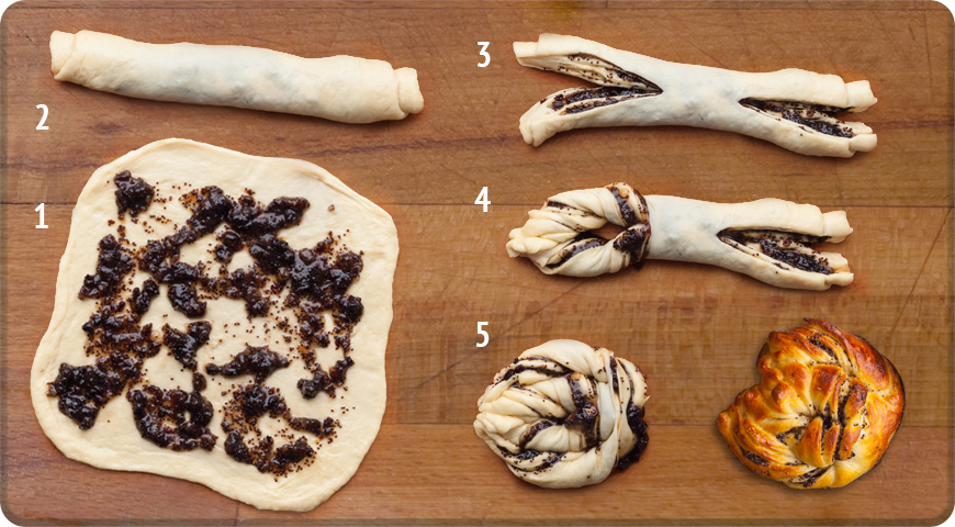 Если чуть усложнить процесс плетения, из рулета получается булочка более сложной и оригинальной формы.