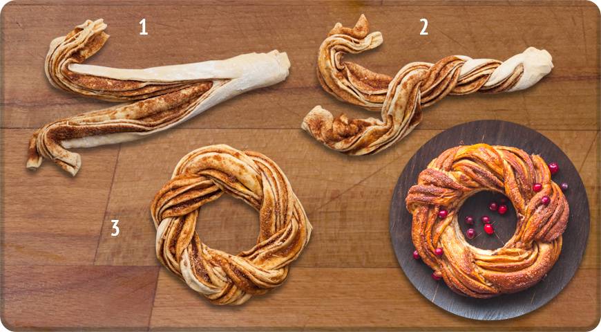 Самый простой вариант для эффектного оформления пирогов или булоче — взять за основу жгут, скатанный из куска, например, дрожжевого теста. Помните, как плести косички, или может вам доступны премудрости плетения узлов макраме? Воспользуйтесь этими знаниями. Длина и толщина жгута зависит от желаемого результата.
