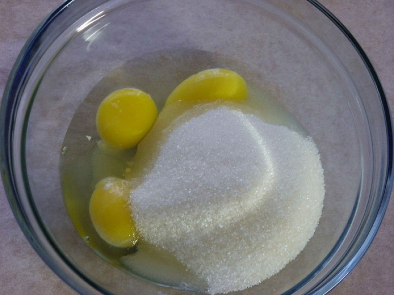 Далее необходимо разбить яйца, смешать с получившейся массой, добавить сахар и всё вместе взбить.