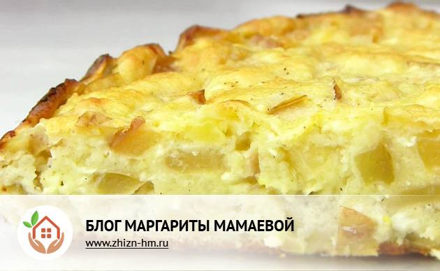 Творожная шарлотка отличается от классического рецепта тем, что сначала в форму выкладывается тесто, а сверху – нарезанные яблоки.