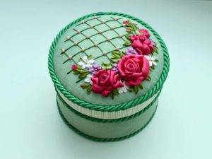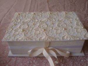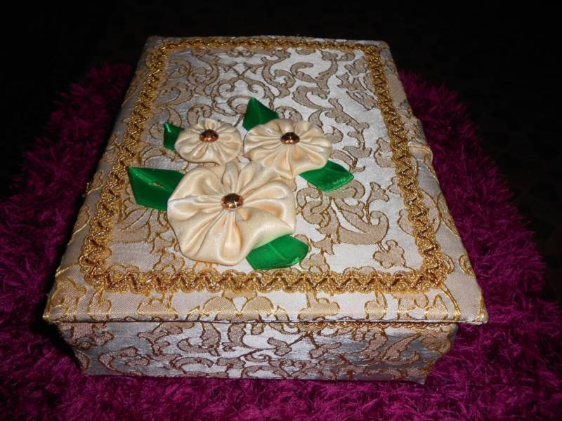 - к верху крышки наклеивается материя и украшается тесьмой;