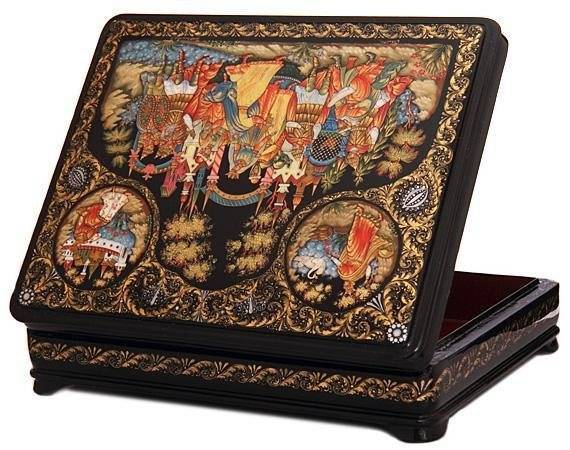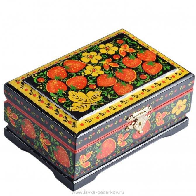 Городецкая роспись. Городецкая роспись также родом из Нижегородской области. Изначально эти яркие рисунки, выполненные свободным мазком, наносили на прялки. Но позднее они получили большое распространение и в таком стиле стали расписывать и другие деревянные предметы, в том числе и шкатулки. Узоры обычно цветочные, сюжетные, либо изображения животных (кони, птицы).Палехская роспись. Как и следует из названия, палехская роспись зародилась в поселке Палех Владимирской губернии. В таком стиле расписывались не только шкатулки, но и брошки, подносы, игольницы и т.п. Чаще всего в качестве основы использовались изделия из папье-маше, которое потом покрывалось лаком.