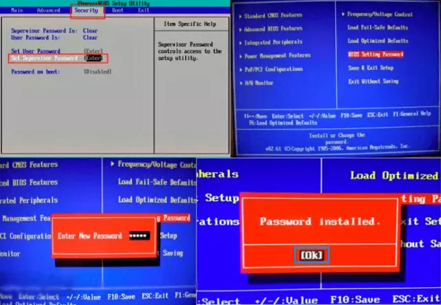 Установка пароля в БИОС осуществляется следующим образом: