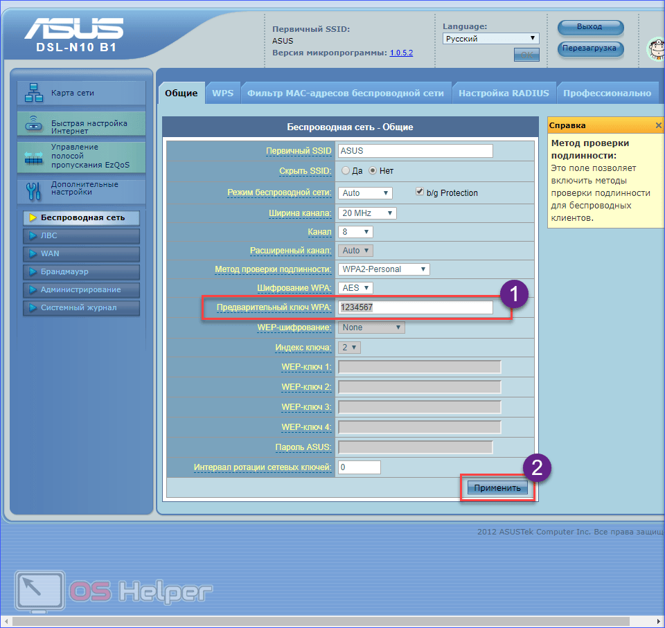 - Введите ключ (1) и примените изменения (2). Дождитесь, пока роутер перезагрузится. Теперь при подключении к Wi-Fi сети вам придется ввести код.