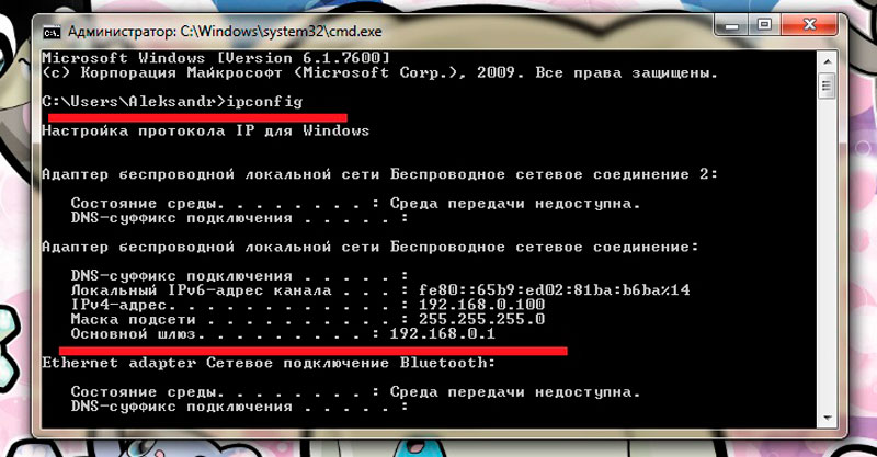 Узнать его можно и в командной строке. Просто подключаемся к сети, открываем командную строку, прописываем команду ipconfig и нажимаем . Далее надо найти строку «Основной шлюз» – там и будет нужный нам адрес.