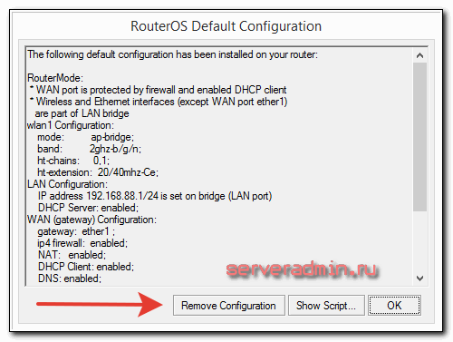 - По-умолчанию устанавливается адресное пространство 192.168.88.0/24. Мне лично не нравятся сетки по-умолчанию, так как если в них случайно воткнуть новое устройство, где будет так же забит умолчательный адрес, то в сети начнутся проблемы. Дома может это и не актуально, но в коммерческих организациях мне приходилось с этим сталкиваться. Поэтому я на всякий случай сетку всегда меняю.