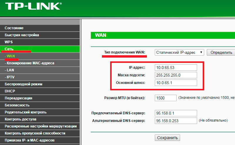 - если в первом пункте установили статический IP, то ниже вводите параметры сети. Если выставили PPPoE, то ниже вводите логин и пароль. Жмете «Сохранить» и перезагружаете роутер.