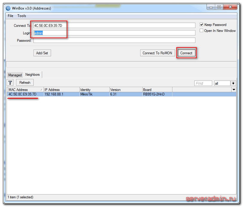 Подключаем роутер к сети, подаем питание и запускаем на компьютере winbox. Переходим на вкладку Neighbors и ждем, когда утилита найдет наш микротик. Это может занять какое-то время. На всякий случай можно нажать Refresh, если роутер долго не обнаруживается.