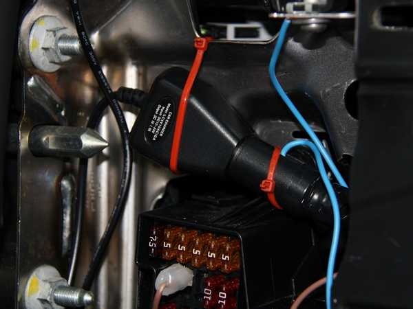 - Конец провода с предохранителем устанавливается в штатный предохранительный блок. Провод с кольцом прижимается одной из крепёжных гаек на торпедо.