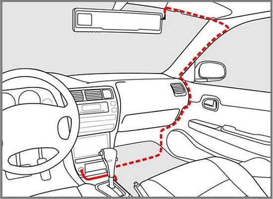 Как известно, видеорегистраторы в основном подключаются к прикуривателю. Это удобно, однако возникает проблема с проводами, которые свисают с лобового стекла и мешают водителю. Для устранения этой проблемы проводку вначале прячут под потолочной панелью в салоне, затем заводят под обшивку одной из стоек, после чего подключают к прикуривателю.