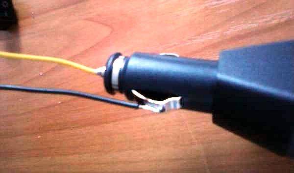 Для подключения «изнутри» нужно к контактам штекера (выбрасывать «коробочку» нельзя, т.к. там находится преобразователь 12В от прикуривателя в 5В для видеорегистратора) припаять два провода. Центральный контакт – это вход +12В, а один из боковых – «земля».