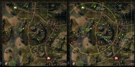 Вот собственно и всё, что можно увидеть на стандартной миникарте в игре. Но в игре есть возможность дополнительно отображать на миникарте некоторую разрешенную информацию. Модов отображения миникарты есть несколько, но мы сравним нашу миникарту с миникартой от XVM (eXtended Visualization Mod – модификация боевого интерфейса для World of Tanks). Эта модификация боевого интерфейса входит в большинство модпаков и выбрать для себя наиболее удобный можно . Далее на скринах с левой стороны у нас будет стандартная миникарта, а с правой стороны миникарта от XVM.