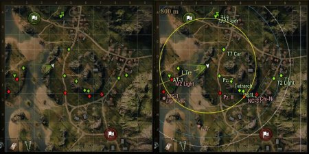 Круг обзора танка, отображаемый на мини-карте, зависит от любых факторов, влияющих на радиус обзора (Просветлённая оптика или Стереотруба, степень владения экипажем основной специальностью и умениями/навыками, снаряжение, контузии экипажа и т. д.) и динамически изменяется во время боя в зависимости от обстоятельств. Круги максимального обзора и отрисовки техники – статичные, то есть не меняются.