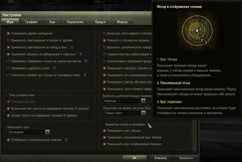 В настройках игры добавлена возможность отключать отображение кругов обзора и отрисовки. Для этого необходимо на вкладке «Игра» выбрать устраивающие вас индикаторы обзора на мини-карте.