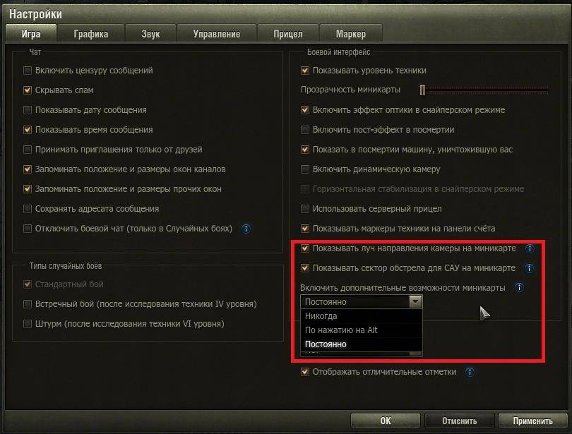 В настройках игры добавлена возможность отключать отображение кругов обзора и отрисовки. Для этого необходимо на вкладке «Игра» выбрать устраивающие вас индикаторы обзора на мини-карте.
