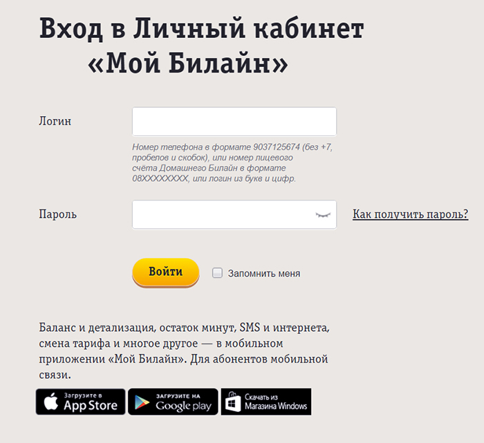 - Воспользуйтесь мобильным приложением «Мой Билайн». Вы можете скачать его App Store для Iphone, в Google Play для Android и в Microsoft для Windows Phone. Мобильное приложение имеет те же функции, что и обычный Личный кабинет. После авторизации, как в предыдущем пункте, вам будет доступен просмотр баланса и остаток минут, смс и трафика;
