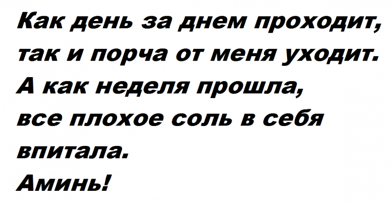 Соль должна быть выброшена из дома. Этот ритуал повторяется в течение семи дней. В этом случае магический ритуал должен читать два раза в день.