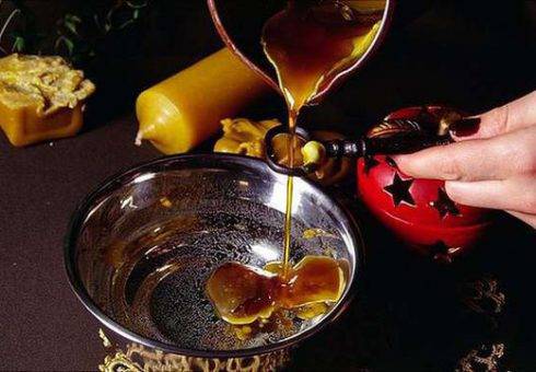 - Емкость с жидким воском в течение 1 минуты водят над головой пострадавшего.