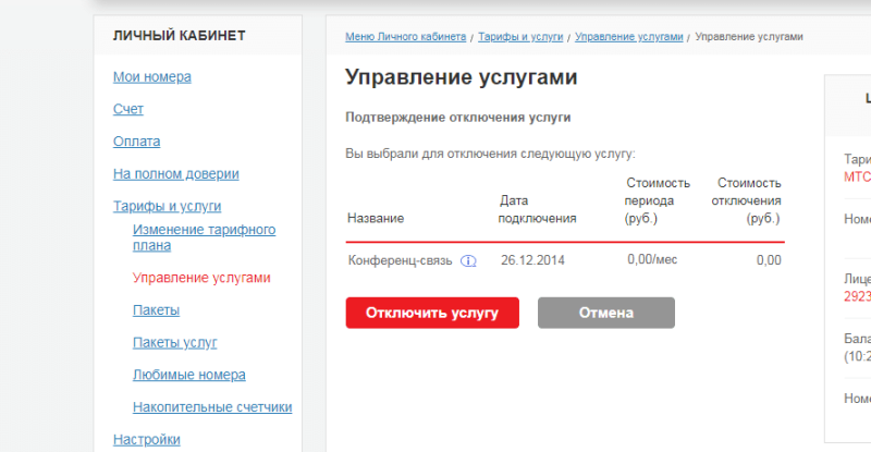 Абонент должен подтвердить свои действия, нажав на кнопку «Отключить услугу». На экране появится информация о том, что услуга отключена или заявка находится в обработке.