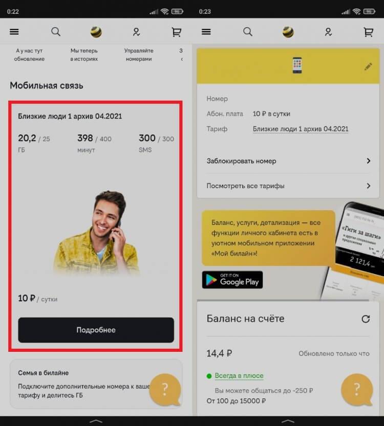 Так выглядит интерфейс приложения билайн. Но и у других операторов удается проверить тарифный план, не открывая дополнительных вкладок. То есть все данные отображаются на главной странице. Если по каким-то причинам вы не можете получить необходимые сведения через мобильную программу, посетите личный кабинет: