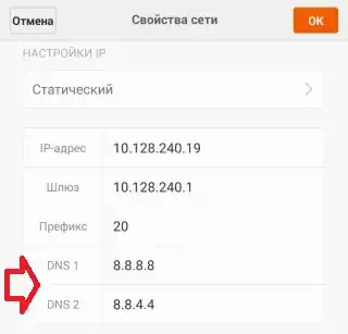 В свойствах сети перейдите к параметру настроек IP и переделайте его на Статический. После этого в полях DNS адресов введите 8.8.8.8 и 8.8.4.4