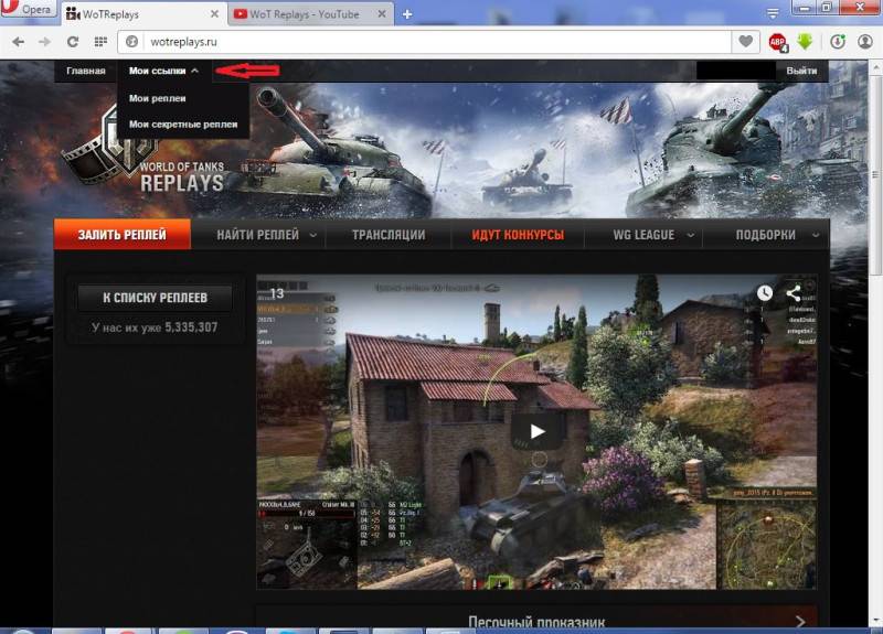 Выполнив вышеперечисленные пункты, вы сможете, наконец, загрузить ваш реплей. Чтобы просматривать сохранённые записи, надо нажать на кнопку «Мои ссылки» в верхнем левом углу экрана, и выбрать из выпадающего списка пункт «Мои реплеи»: