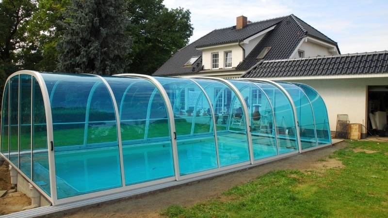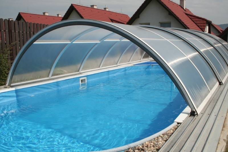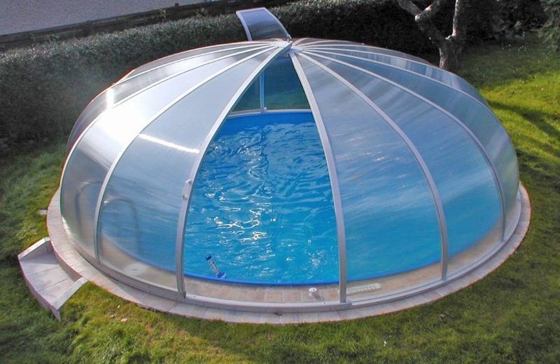 - стационарными. Возводятся над бассейнами на дачи, чтобы защитить их от грязи и осадков. Позволяют продлить сроки купания.