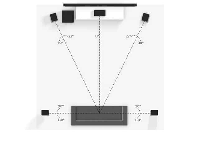 - Зрительские места не должны быть у самой стены, так как позади должны разместиться задние колонки. Они в свою очередь примерно на высоте головы слушателя или немного выше.