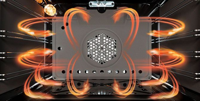 Встроенный в задней части корпуса вентилятор разгоняет горячий воздух, таким образом обеспечивается равномерный прогрев. С этой опцией можно забыть о ситуации когда, например, дно пирога подгорело, а верх остался непропеченным.